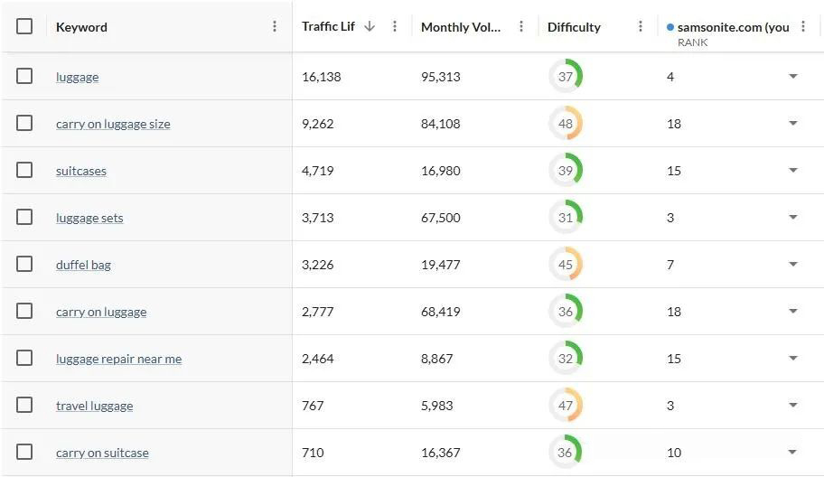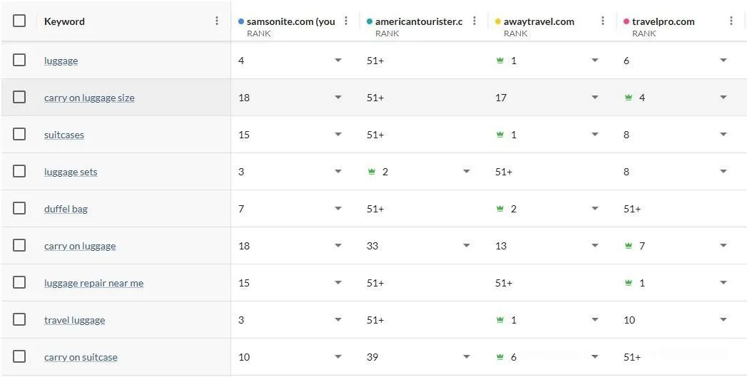 關(guān)鍵詞差距分析可能會讓人不知所措,火車時(shí)間顯示在出發(fā)板上,乘客前往 11 號站臺,但這是適合您業(yè)務(wù)的目的地嗎?現(xiàn)在你可以自信地回答這個(gè)問題,僅僅因?yàn)楦偁帉κ謱﹃P(guān)鍵詞有排名并不意味著它與你的網(wǎng)站相關(guān)或有利可圖。默認(rèn)情況下,Keyword Gap 2.0 專注于您已經(jīng)排名但還有改進(jìn)空間的關(guān)鍵字。請考慮 Samsonite 示例中的以下結(jié)果:
