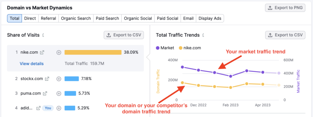網(wǎng)站流量的波動(dòng)可能受到多種因素的影響,包括市場(chǎng)整體趨勢(shì)、競(jìng)爭(zhēng)對(duì)手的動(dòng)態(tài)以及行業(yè)季節(jié)性變化。在分析流量下降時(shí),首先需要確定流量下降的具體類型(如自然搜索流量、付費(fèi)搜索流量、推薦流量等),并將其與競(jìng)品和行業(yè)整體趨勢(shì)進(jìn)行對(duì)比。例如,借助Market Explorer工具,可以查看市場(chǎng)整體流量趨勢(shì),并與自己的網(wǎng)站進(jìn)行對(duì)比,判斷是否是整個(gè)行業(yè)流量下滑,或者是否有新的競(jìng)爭(zhēng)對(duì)手搶占了市場(chǎng)份額。