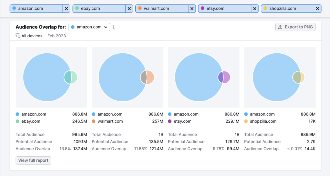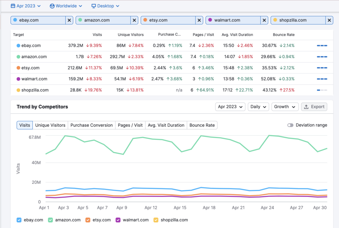 查看所有競(jìng)品的歷史流量統(tǒng)計(jì),如果他們的流量持續(xù)增長(zhǎng)(綠色數(shù)字表示正向增長(zhǎng)),而你卻在下滑(紅色數(shù)字),這將幫助你了解流量流失的原因,以及誰在爭(zhēng)奪你的流量。在Trends by Competitor圖表中,您可以按天、周或月查看數(shù)據(jù),精確找出流量下降的時(shí)間段。另一種查看方法是比較Audience Overlap(受眾重疊度):如果你現(xiàn)在與競(jìng)爭(zhēng)對(duì)手重疊的受眾比以前更多了(而獨(dú)立訪客數(shù)有所下降),這意味著他們可能已搶走了你的部分受眾——接下來的任務(wù)就是找出他們是如何做到的。