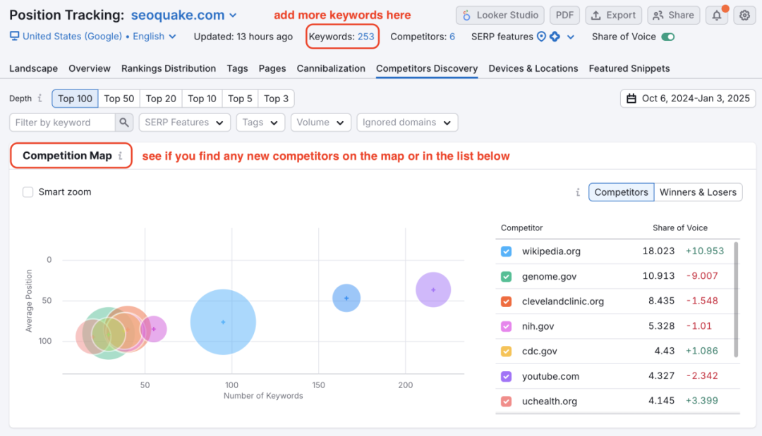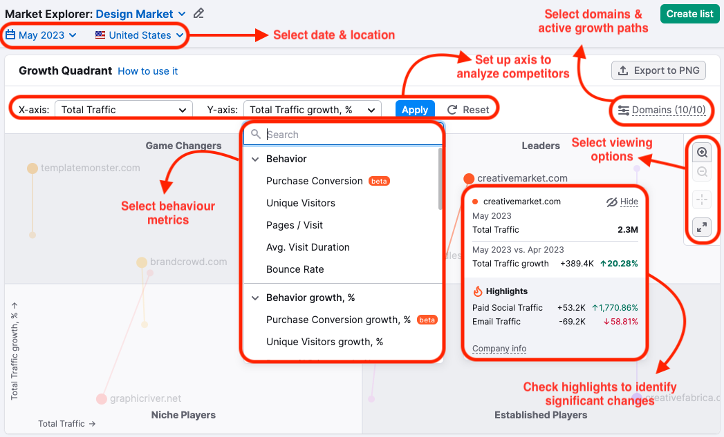 流量下降的另一個(gè)可能原因是新競(jìng)爭(zhēng)對(duì)手的出現(xiàn)。通過Position Tracking工具,可以監(jiān)測(cè)特定地區(qū)的關(guān)鍵詞競(jìng)爭(zhēng)情況,發(fā)現(xiàn)新的競(jìng)爭(zhēng)對(duì)手。此外,Market Explorer的Growth Quadrant功能可以幫助你識(shí)別那些流量增長(zhǎng)迅速的“Game Changers”,這些網(wǎng)站可能對(duì)你的市場(chǎng)份額構(gòu)成威脅。