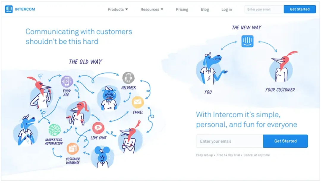 Intercom用生動的手繪風插畫描繪了一副工作中遭遇的混亂場景,引出了使用Intercom可以結(jié)束這一切混亂的概念:
