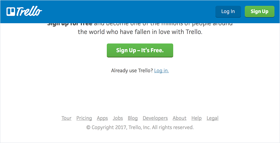 例如辦公協(xié)作應用Trelllo的官網(wǎng)頂部沒有導航,只保留了登陸和注冊入口。頁面的信息組織