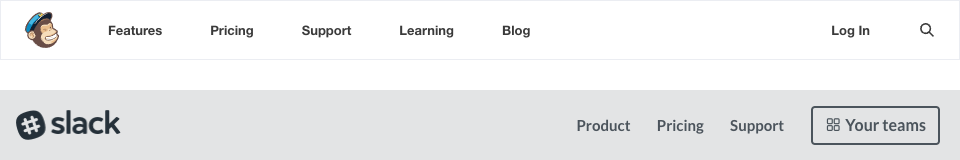 例如企業(yè)郵件應用Mailchimp和Slack就是扁平結(jié)構(gòu)的典型代表,它們的導航都只有一級,把所有頁面入口都放在外面,最重要的功能、定價位于前兩個位置,其余的根據(jù)重要性遞減排列,最右邊一般會放注冊或登陸入口: