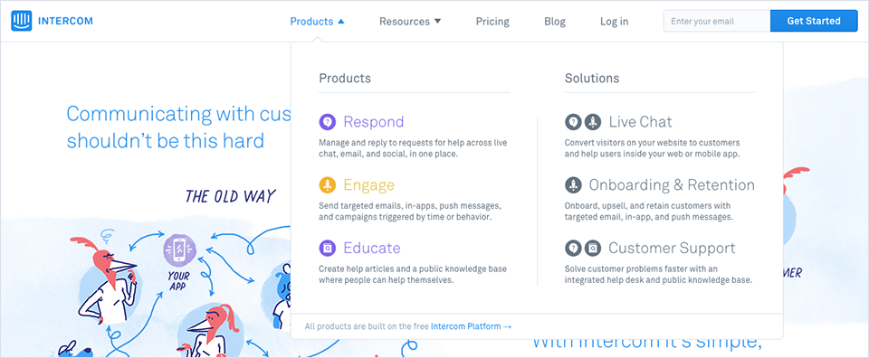 以Intercom為例,它是一款大型CRM應用,公司旗下有三大子產(chǎn)品。官網(wǎng)首頁設(shè)置了5個一級導航,其中前兩個是折疊導航。最重要的Products導航的下拉菜單中按照產(chǎn)品和解決方案兩個維度展示了對應的信息。配合icon和簡介,有序又直觀: