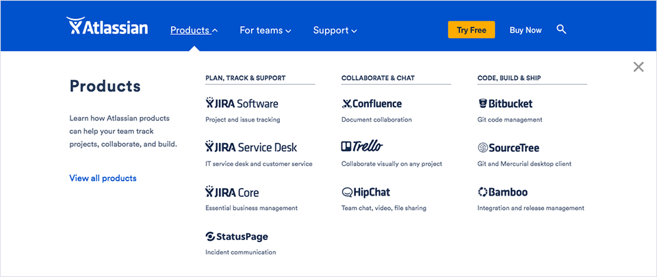 再看看Atlassian的設(shè)計。到達子產(chǎn)品頁后會保留主導航,隨著頁面滾動,子產(chǎn)品導航會把主導航推出,繼而代替主導航的位置: