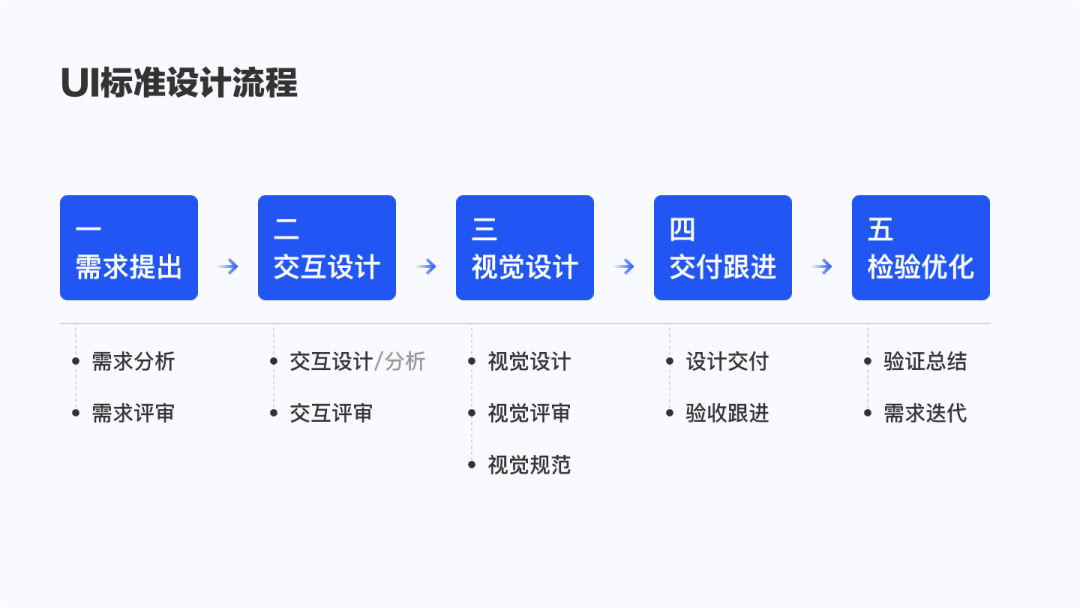 設(shè)計SOP的5個關(guān)鍵步驟:需求提出 - 交互設(shè)計 - 視覺設(shè)計 - 交付跟進 - 檢驗優(yōu)化