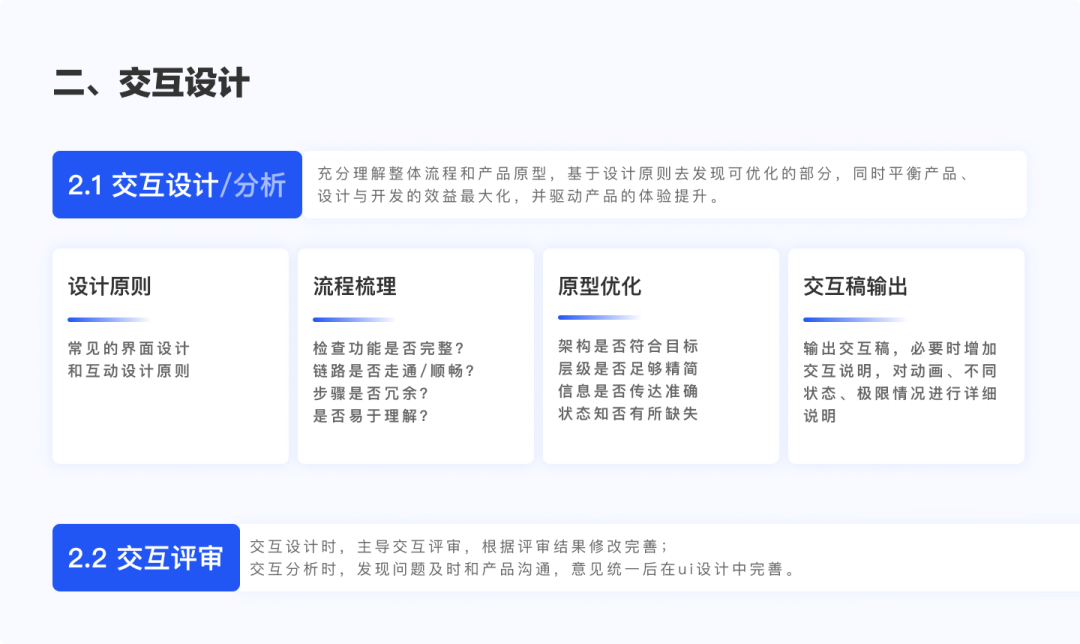 交互設(shè)計要做的是如何合理組織產(chǎn)品內(nèi)容(信息架構(gòu))?并思考如何與用戶互動?設(shè)計師需要充分理解業(yè)務(wù)和目標(biāo)、整體流程和交互原型,基于設(shè)計原則判斷其合理性,發(fā)現(xiàn)可優(yōu)化的地方,并且能平衡產(chǎn)品、設(shè)計、開發(fā)的效益,提升效益的同時也能提升產(chǎn)品體驗。交互設(shè)計環(huán)節(jié)并不是每個需求都需要,可根據(jù)具體需求而定,對于流程比較簡單的需求,可以直接進行視覺設(shè)計,但同樣需要交互分析。