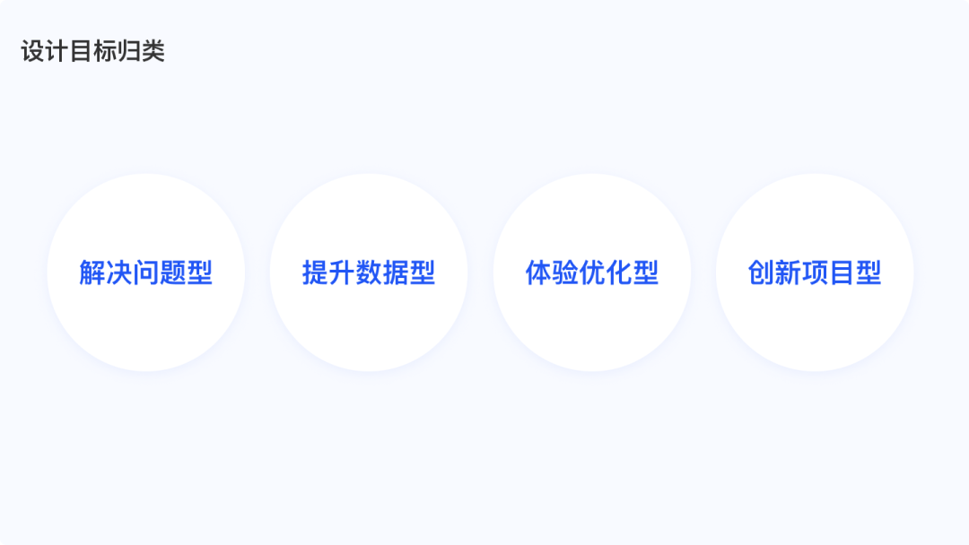 設(shè)計目標(biāo)可以歸納為4類:解決問題型、提升數(shù)據(jù)型、體驗優(yōu)化型、創(chuàng)新項目型,同時還要看產(chǎn)品處于什么階段:啟動期、成長期、成熟期、衰退期。結(jié)合業(yè)務(wù)目標(biāo)和用戶目標(biāo)推導(dǎo)+拆解設(shè)計目標(biāo),針對不同的設(shè)計目標(biāo)制定相應(yīng)的設(shè)計策略。