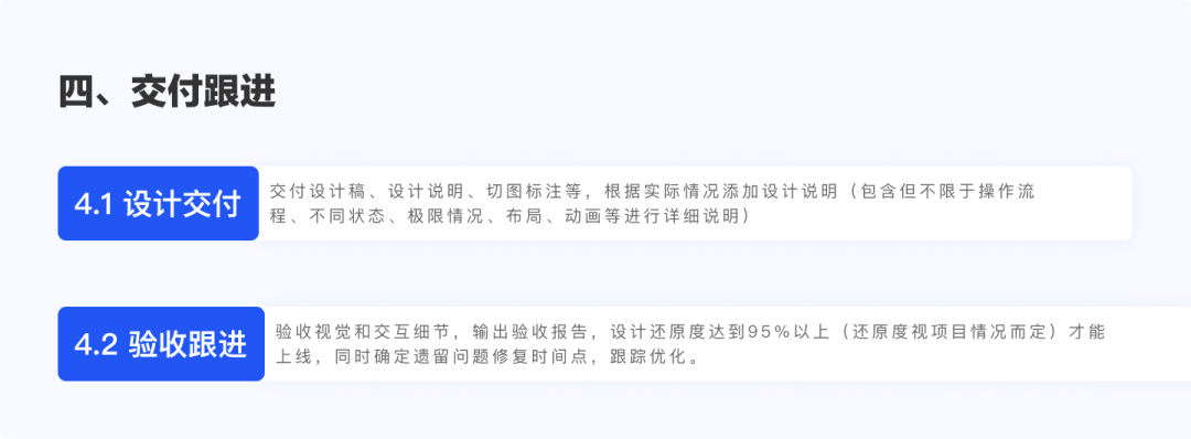 設(shè)計驗收是為了確保滿足需求、體驗流暢、設(shè)計細(xì)節(jié)落地到位。開發(fā)結(jié)束后進入測試階段,設(shè)計師就可以進行設(shè)計驗收了。驗收結(jié)果以走查報告在線文檔對接,跟蹤檢查開發(fā)二次走查情況,設(shè)計還原度通常要求達(dá)到95%以上才能上線。走查報告需注明優(yōu)先級,方便開發(fā)優(yōu)先調(diào)整,如果在上線截止時間還沒調(diào)整完,需要和開發(fā)確定遺留問題修復(fù)的時間點,后續(xù)持續(xù)跟蹤優(yōu)化。