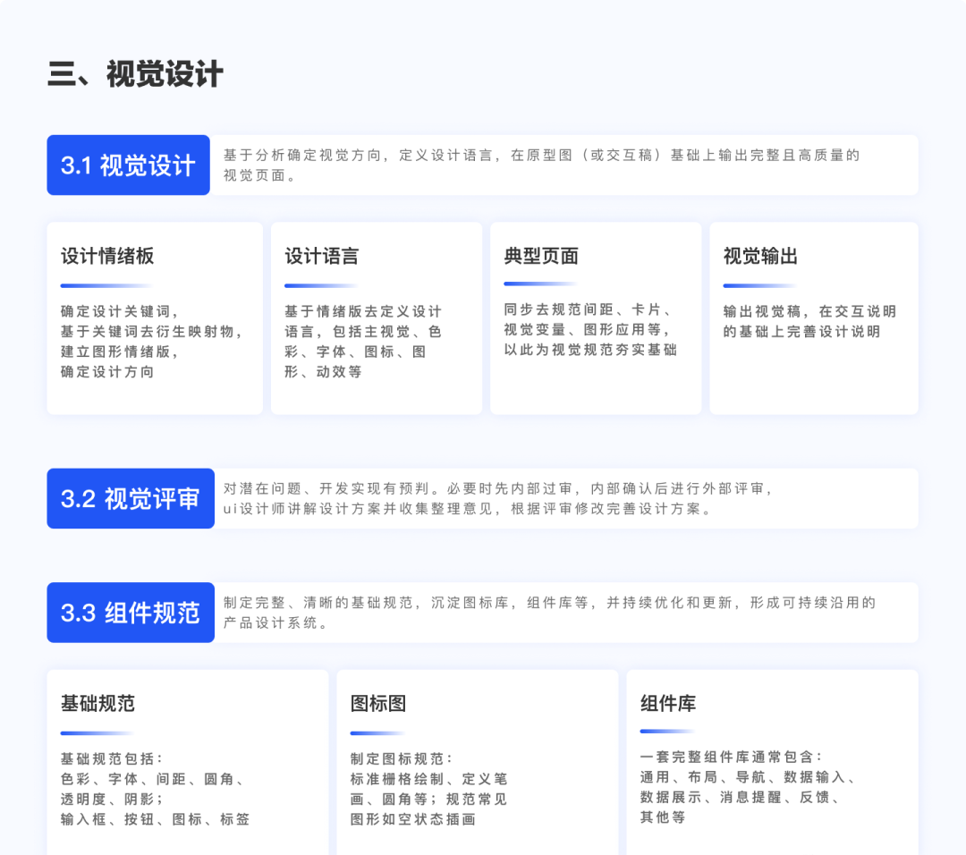 設(shè)計好典型頁面后,可以先設(shè)計內(nèi)部討論確定,然后和業(yè)務(wù)方、產(chǎn)品經(jīng)理簡單過一遍,確定沒問題,就可以以典型頁面為基準(zhǔn)輸出其他頁面了。全部視覺稿輸出完成,還需要在交互說明的基礎(chǔ)上補充完善設(shè)計說明。