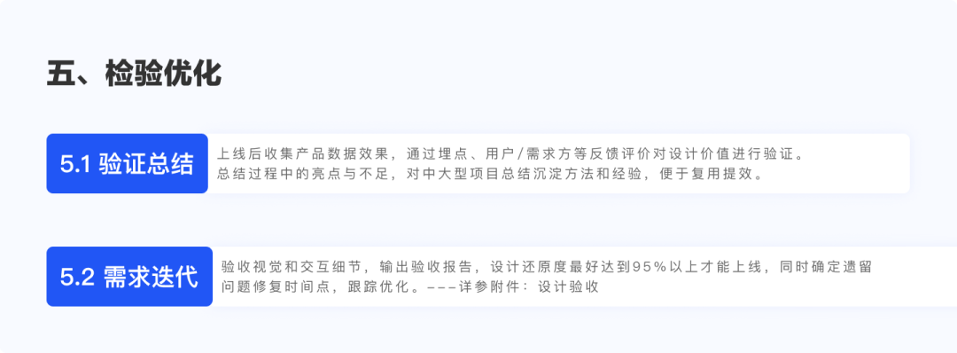 上線后設(shè)計師需要收集相關(guān)的數(shù)據(jù)結(jié)果,可以通過埋點,也可以通過需求方、用戶等的反饋評價對設(shè)計價值進行評估驗證。上線不是結(jié)束,需要總結(jié)亮點和不足,加以優(yōu)化;大中型項目還需要總結(jié)沉淀方法和經(jīng)驗,便于提升未來設(shè)計的準(zhǔn)確性,也便于復(fù)用提效。