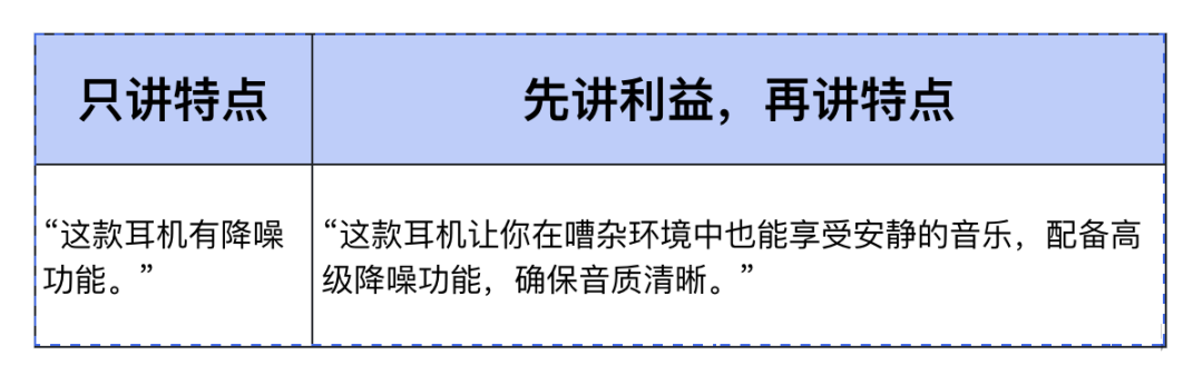 在這個(gè)示例中,通過先描述耳機(jī)帶來的“安靜音樂體驗(yàn)”,然后再介紹降噪功能,能讓用戶感受到更大的吸引力。